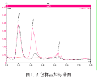 從市場(chǎng)和超市中選取兩種面包產(chǎn)品,上述離子色譜條件分析,所得回收率結(jié)果分別為98%和106%。樣品加標(biāo)色譜圖如圖2所示。表1為面包樣品的測(cè)定結(jié)果。由這些數(shù)據(jù)可以看出,在所檢測(cè)的兩種面包中均含有不同含量的溴酸鹽。