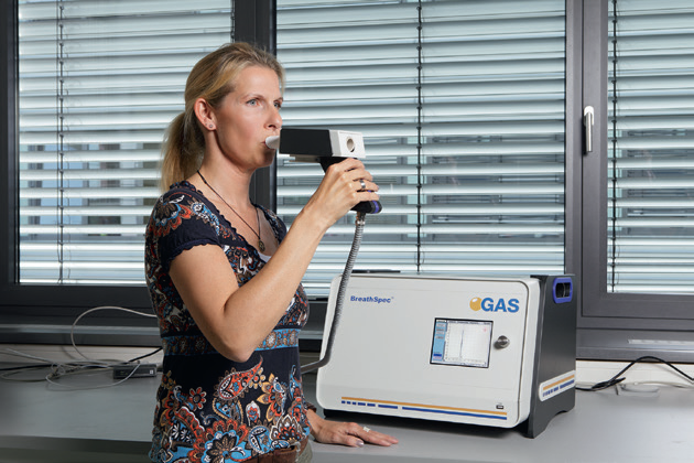 遠(yuǎn)程取樣—呼吸采樣: 實際呼吸采樣只需一次呼氣。待測者呼氣進(jìn)入采樣器,在后半部分,將5mL呼氣取樣到普通的注射器中。拉動注射器的活塞可以由待測者自己完成,或者由護(hù)士來幫助完成。如果采樣失敗,可以立即重復(fù)。